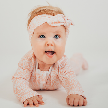 Extra kényelmes barackivárgos útvesztő mintás masni az újszülöttek fejére vagy gyerekek hajába. A fejpánt megkötős, így pont a fej méretéhez igazítható. Kiváló választás egy sima hétköznapra vagy egy csinos öltözet kiegészítve kislányoknak karácsonyra. Összeillő szettekhez, baba fotózáshoz, ajándékba.